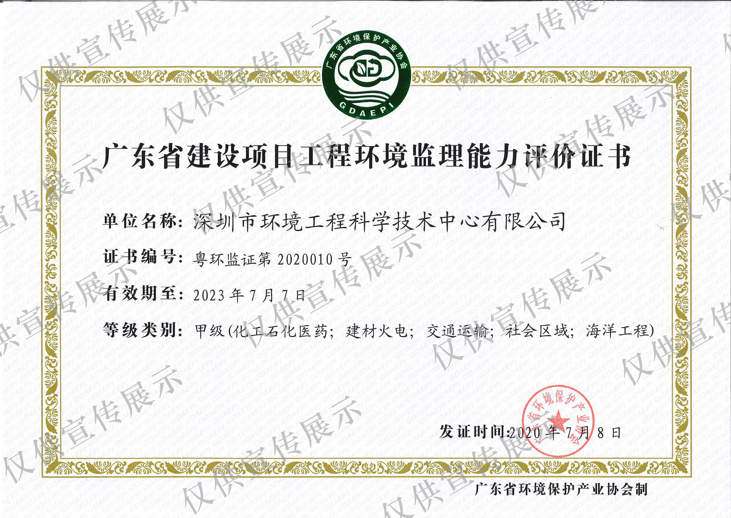 廣東省建設項目工程環境監理能力評價證書